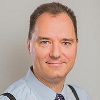 A man with short brown hair, wearing a light blue dress shirt, a patterned tie, and black braces, smiles slightly whilst facing the camera against a plain light background.